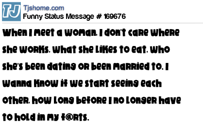 X When I meet a woman, I don't care where she works, what she likes to eat, who she's been dating or been married to. I wanna know if we start seeing each other, how long before I no longer have to hold in my f@rts.