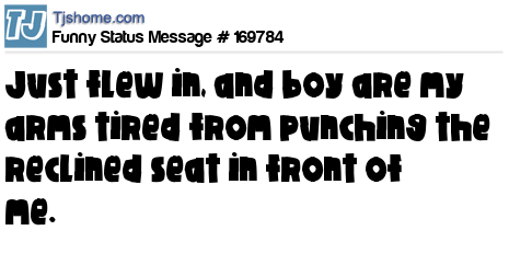 X says Just flew in, and boy are my arms tired from punching the reclined seat in front of me.