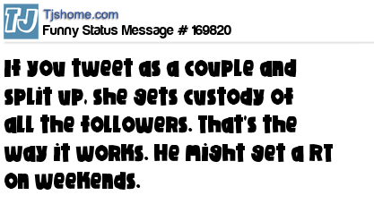 X says If you tweet as a couple and split up, she gets custody of all the followers. That's the way it works. He might get a RT on weekends.