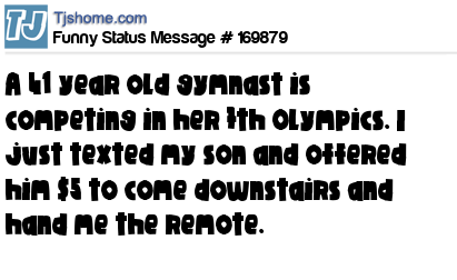 X says A 41 year old gymnast is competing in her 7th Olympics. I just texted my son and offered him $5 to come downstairs and hand me the remote.