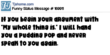 X says If you begin your argument with "My whole thing is," I will hand you a pudding pop and never speak to you again.