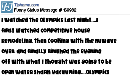 X says I watched the Olympics last night....I first watched competitive house remodeling, then Cooking with the nuwave oven, and finally finished the evening off with what I thought was going to be open water shark vacuuming....Olympics have sure changed...