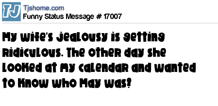 X says My wife's jealousy is getting ridiculous. The other day she looked at my calendar and wanted to know who May was?