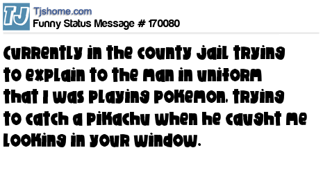 X is currently in the county jail trying to explain to the man in uniform that I was playing pokemon, trying to catch a pikachu when he caught me looking in your window.