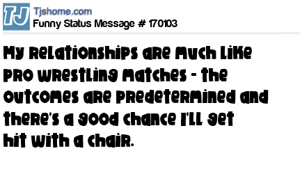 X says My relationships are much like pro wrestling matches - the outcomes are predetermined and there's a good chance I'll get hit with a chair.
