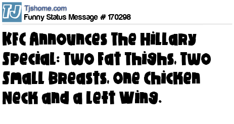 X KFC Announces The Hillary Special: Two Fat Thighs, Two Small Breasts, One Chicken Neck and a Left Wing.