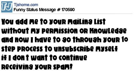 X says You add me to your mailing list without my permission or knowledge and now I have to go through your 10 step process to unsubscribe myself if I don’t want to continue receiving your spam?