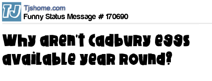 - # 38974 Update on my diet....its December and so far this year I've lost 12 months!! I would like to thank the website I found that allows me to purchase Cadbury mini eggs year round!!