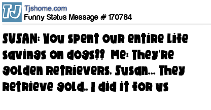 X says SUSAN: You spent our entire life savings on dogs??  Me: They're golden retrievers, Susan... They retrieve gold,, I did it for us