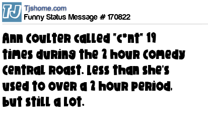 X says Ann Coulter called "c*nt" 19 times during the 2 hour Comedy Central roast. Less than she's used to over a 2 hour period, but still a lot.