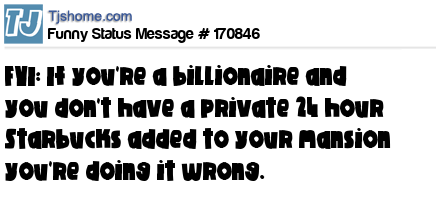 X says FYI: If you're a billionaire and you don't have a private 24 hour Starbucks added to your mansion you're doing it wrong.