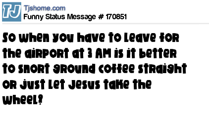 X says So when you have to leave for the airport at 3 AM is it better to snort ground coffee straight or just let Jesus take the wheel?