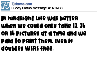 X says In hindsight life was better when we could only take 12, 24 or 36 pictures at a time and we paid to print them. Even if doubles WERE free.