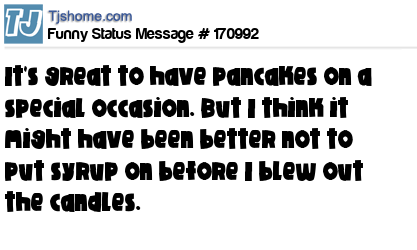 X says It's great to have pancakes on a special occasion. But I think it might have been better not to put syrup on before I blew out the candles.