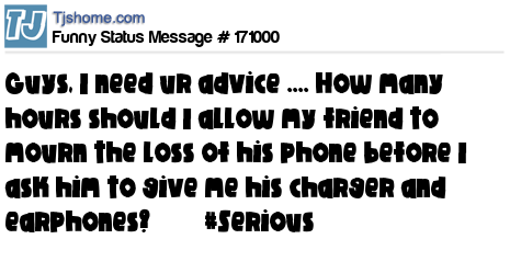 X says Guys, I need ur advice .... How many hours should I allow my friend to mourn the loss of his phone before I ask him to give me his charger and earphones? 🌚#Serious