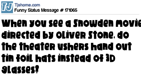 X says When you see a Snowden movie directed by Oliver Stone, do the theater ushers hand out tin foil hats instead of 3D glasses?
