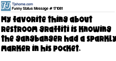 X says My favorite thing about restroom graffiti is knowing the gangbanger had a sparkly marker in his pocket.