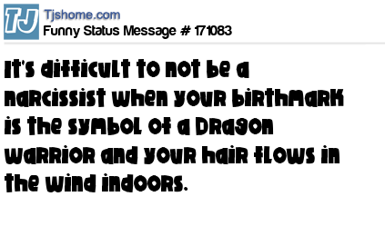 X says It's difficult to not be a narcissist when your birthmark is the symbol of a Dragon warrior and your hair flows in the wind indoors.