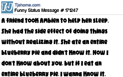 X A friend took Ambien to help her sleep. She had the side effect of doing things without realizing it. She ate an entire blueberry pie and didn't know it. Now I don't know about you, but if I eat an entire blueberry pie, I wanna know it.