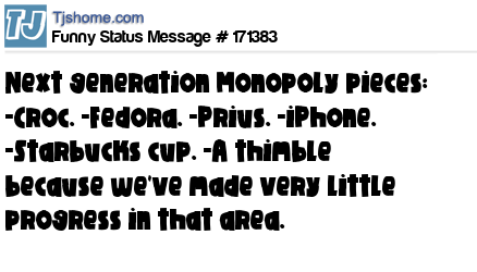 X says Next generation Monopoly pieces: -Croc. -Fedora. -Prius. -iPhone. -Starbucks cup. -A thimble because we've made very little progress in that area.