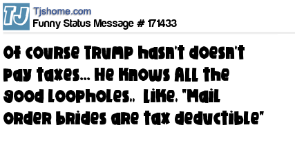 X says Of course Trump hasn't doesn't pay taxes... He knows ALL the good loopholes,, Like, "Mail order brides are tax deductible"