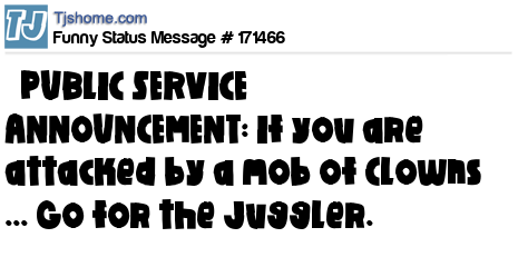 X says PUBLIC SERVICE ANNOUNCEMENT: If you are attacked by a mob of Clowns ... Go for the Juggler.