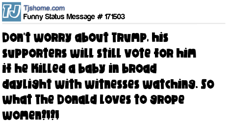 X says Don't worry about Trump, his supporters will still vote for him if he killed a baby in broad daylight with witnesses watching. So what The Donald loves to grope women?!?!