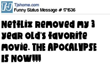 X says Netflix removed my 3 year old's favorite movie. THE APOCALYPSE IS NOW!!!