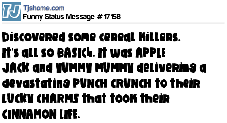 X discovered some cereal killers. It's all so BASIC4. It was APPLE JACK and YUMMY MUMMY delivering a devastating PUNCH CRUNCH to their LUCKY CHARMS that took their CINNAMON LIFE.