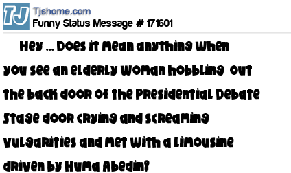 X says Hey ... Does it mean anything when you see an elderly woman hobbling out the back door of the Presidential Debate Stage door crying and screaming vulgarities and met with a limousine driven by Huma Abedin?