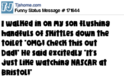 X says I walked in on my son flushing handfuls of Skittles down the toilet "OMG! Check this out Dad!" He said excitedly "It's just like watching NASCAR at Bristol!"