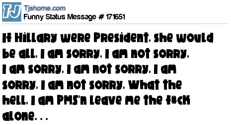 X says If Hillary were President, she would be all, I am sorry, I am not sorry, I am sorry, I am not sorry, I am sorry, I am not sorry, What the hell, I am PMS'n leave me the f#ck alone. . .
