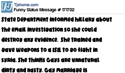 X says State Department informed hillary about the email investigation so she could destroy any evidence.  She trained and gave weapons to a ISIL to go fight in syria. She thinks Gays are unnatural dirty and nasty. Gay marriage is acceptable to keep their vote