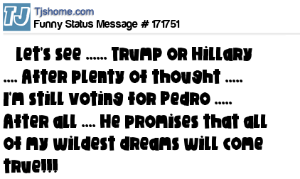 X says Let's see ...... Trump or Hillary .... After plenty of thought ..... I'm still voting for Pedro ..... After all .... He promises that all of my wildest dreams will come true!!!