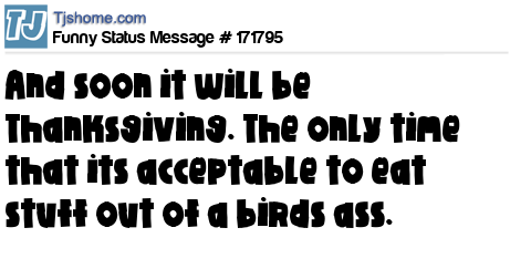 X says And soon it will be Thanksgiving. The only time that its acceptable to eat stuff out of a birds ass.