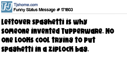 X says Leftover spaghetti is why someone invented Tupperware. No one looks cool trying to put spaghetti in a ziplock bag.