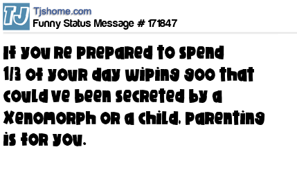 X says If you’re prepared to spend 1/3 of your day wiping goo that could’ve been secreted by a Xenomorph or a child, parenting is for you.