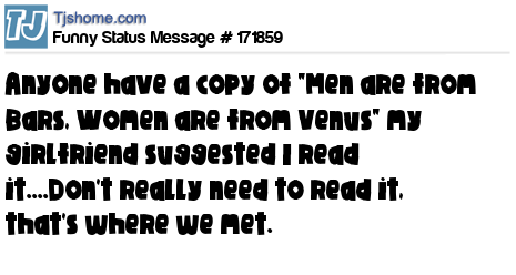 X says Anyone have a copy of "Men are from Bars, Women are from Venus" my girlfriend suggested I read it....Don't really need to read it, that's where we met.