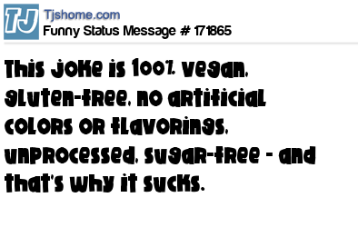 X says This joke is 100% vegan, gluten-free, no artificial colors or flavorings, unprocessed, sugar-free - and that's why it sucks.