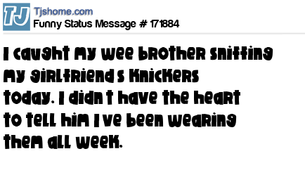 X I caught my wee brother sniffing my girlfriend’s knickers today. I didn’t have the heart to tell him I’ve been wearing them all week.