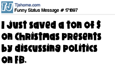 - # 115217 I just saved a TON of money on Christmas presents by discussing politics on Facebook.