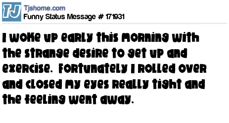 X is I woke up early this morning with the strange desire to get up and exercise. Fortunately I rolled over and closed my eyes really tight and the feeling went away.