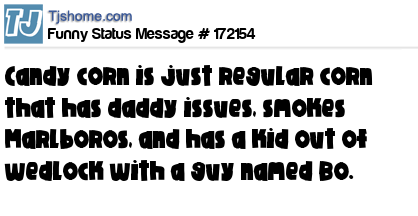 X says Candy corn is just regular corn that has daddy issues, smokes Marlboros, and has a kid out of wedlock with a guy named Bo.