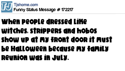 - # 207290 When people dressed like witches, strippers and hobos show up at my front door it must be Halloween because my family reunion was in July. 🤔