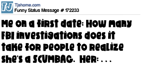 X says Me on a first date: How many FBI investigations does it take for people to realize she's a SCUMBAG. Her: . . .