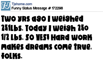 X says Two yrs ago I weighed 251lbs. Today I weigh 250 1/2 lbs. SO YES! Hard work makes dreams come true, folks.
