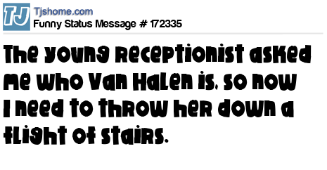 X says The young receptionist asked me who Van Halen is, so now I need to throw her down a flight of stairs.