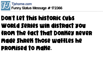 X says Don't let this historic Cubs World Series win distract you from the fact that Donkey never made Shrek those waffles he promised to make.