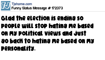 - # 171273 I can't wait til the Presidential race ends so we can stop hating people for their politics and go back to hating people because they're jerks