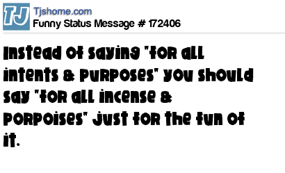 X says Instead of saying "for all intents & purposes" you should say "for all incense & porpoises" just for the fun of it.